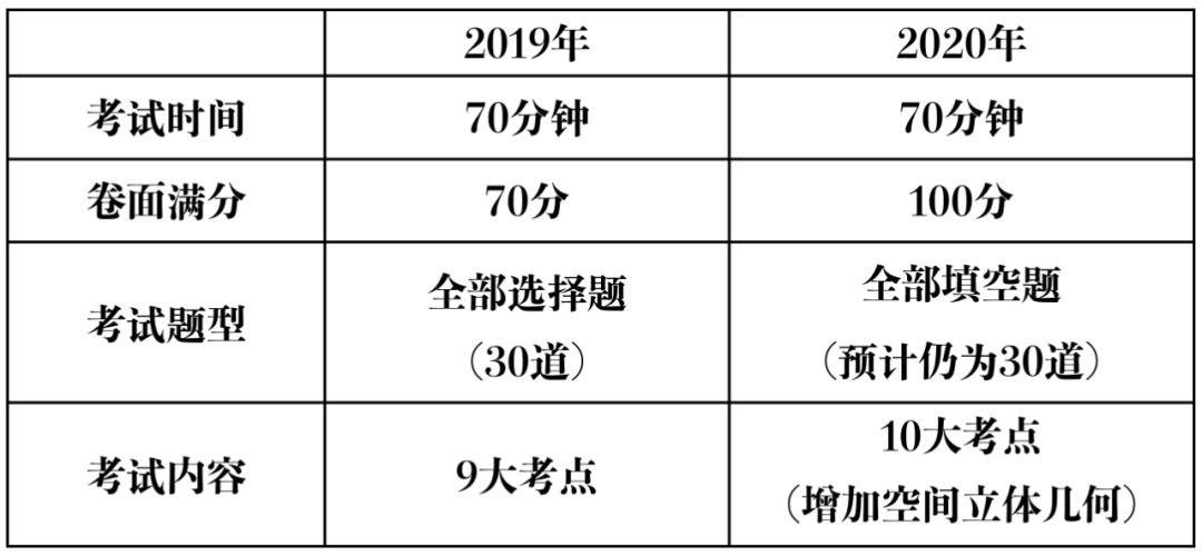 1.考试时间70分钟,没有发生变化,试卷满分从70分增加到100分,预计每道题的分值会增大,考试题型从选择题变成填空题,“运气”成分变少,考试成绩更具客观性。