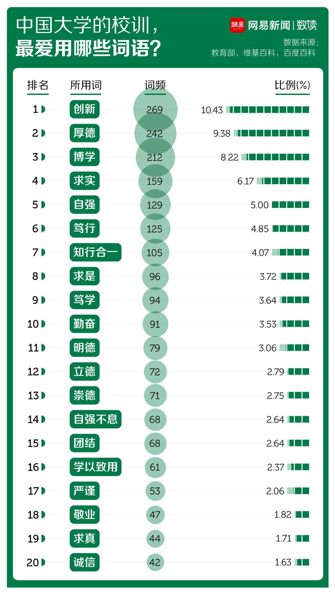 如“创新”一词,10%的高校校训中都使用了它。“厚德”出现的比例也不低,有9%的高校把它写进了校训。
