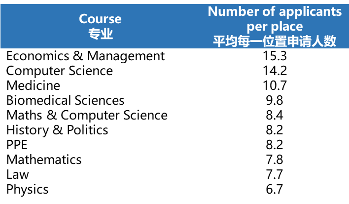 牛津录取统计数据显示,2016-2018年,10大竞争最为激烈的专业为: