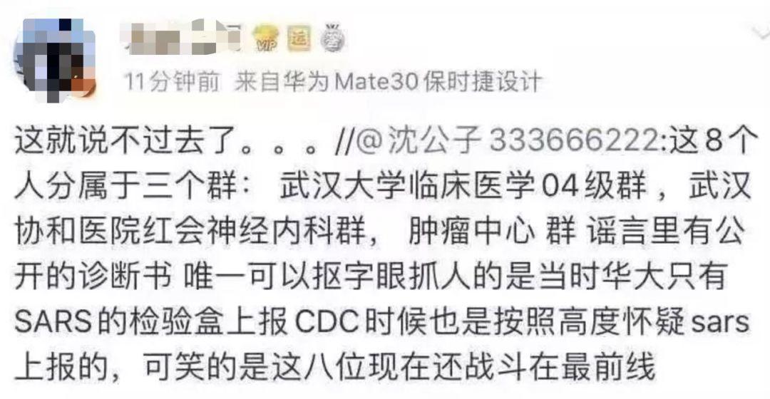 而最初散布“谣言”的温床,分属三个医科内部群:武汉大学临床医院04级群、武汉协和医院红会神经内科群,肿瘤中心群。